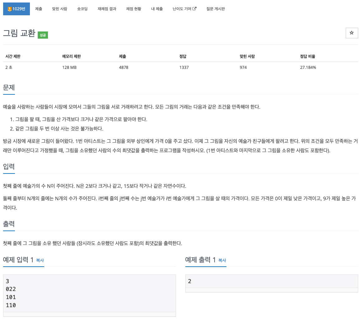 첫째 줄에 예술가의 수 N이 주어진다. N은 2보다 크거나 같고, 15보다 작거나 같은 자연수이다. 둘째 줄부터 N개의 줄에는 N개의 수가 주어진다. i번째 줄의 j번째 수는 j번 예술가가 i번 예술가에