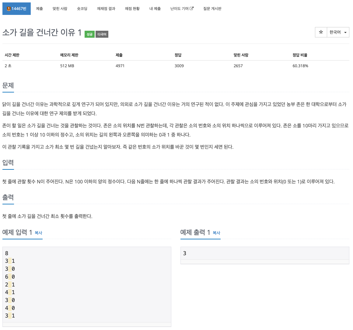 3번 소는 위치 1, 0, 1에서 관찰되었으므로 길을 최소 두 번 건넜음을 확인할 수 있다. 4번 소도 길을 한 번 건넜으며, 나머지 소는 길을 건넌 기록이 확인되지 않는다.