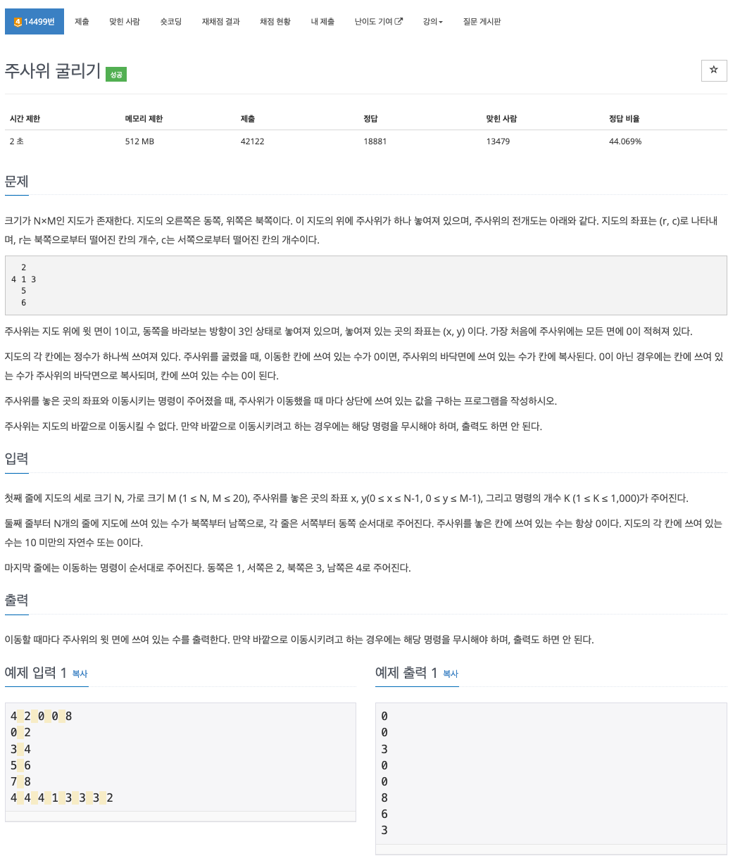 첫째 줄에 지도의 세로 크기 N, 가로 크기 M (1 ≤ N, M ≤ 20), 주사위를 놓은 곳의 좌표 x, y(0 ≤ x ≤ N-1, 0 ≤ y ≤ M-1), 그리고 명령의 개수 K (1 ≤ K ≤ 1,000)가 주어진다. 둘째 줄부터 N개의 줄에 지
