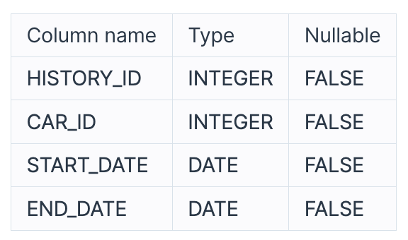 다음은 어느 자동차 대여 회사의 자동차 대여 기록 정보를 담은 CAR_RENTAL_COMPANY_RENTAL_HISTORY 테이블입니다. CAR_RENTAL_COMPANY_RENTAL_HISTORY 테이블은 아래와 같은 구조로 되어있으며, HISTORY_ID, CAR_ID, START_DATE, END_DATE 는 각각 자동차 대여 기록 ID, 자동차 ID, 대여 시작일, 대여 종료일을 나타냅니다.
