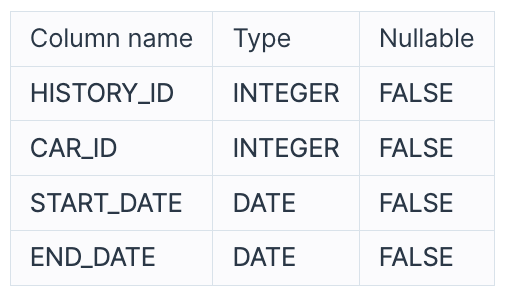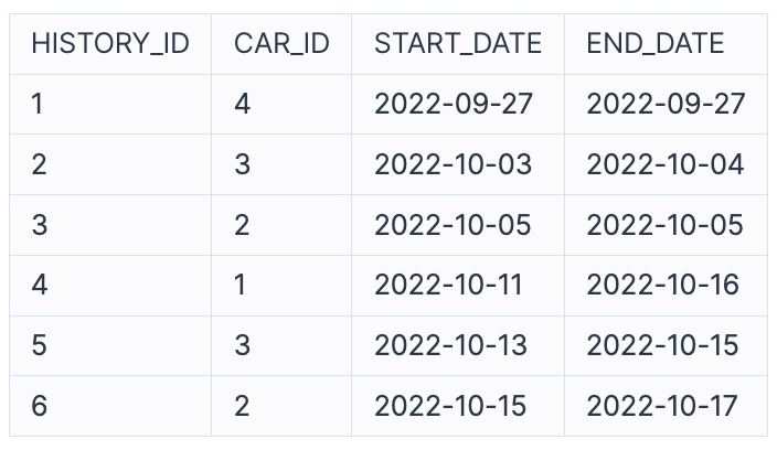 다음은 어느 자동차 대여 회사의 자동차 대여 기록 정보를 담은 CAR_RENTAL_COMPANY_RENTAL_HISTORY 테이블입니다. CAR_RENTAL_COMPANY_RENTAL_HISTORY 테이블은 아래와 같은 구조로 되어있으며, HISTORY_ID, CAR_ID, START_DATE, END_DATE 는 각각 자동차 대여 기록 ID, 자동차 ID, 대여 시작일, 대여 종료일을 나타냅니다.