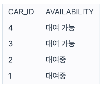 2022년 10월 16일에 대여 중인 자동차는 자동차 ID가 1, 2인 자동차이고, 대여 가능한 자동차는 자동차 ID가 3, 4이므로, '대여중' 또는 '대여 가능' 을 표시하는 컬럼을 추가하고, 자동차 ID를 기준으로 내림차순 정렬하면 다음과 같이 나와야 합니다.