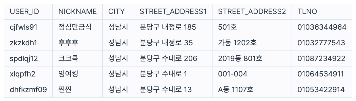 USED_GOODS_USER 테이블은 다음과 같으며 USER_ID, NICKNAME, CITY, STREET_ADDRESS1, STREET_ADDRESS2, TLNO는 각각 회원 ID, 닉네임, 시, 도로명 주소, 상세 주소, 전화번호를 의미합니다.