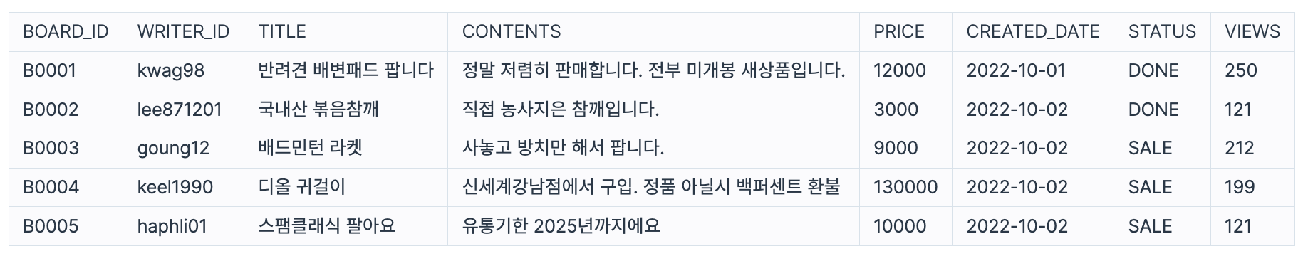 다음은 중고거래 게시판 정보를 담은 USED_GOODS_BOARD 테이블과 중고거래 게시판 첨부파일 정보를 담은 USED_GOODS_FILE 테이블입니다. USED_GOODS_BOARD 테이블은 다음과 같으며 BOARD_ID, WRITER_ID, TITLE, CONTENTS, PRICE, CREATED_DATE, STATUS, VIEWS은 게시글 ID, 작성자 ID, 게시글 제목, 게시글 내용, 가격, 작성일, 거래상태, 조회수를 의미합니다.