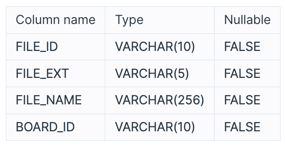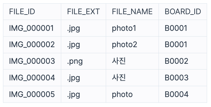 USED_GOODS_FILE 테이블은 다음과 같으며 FILE_ID, FILE_EXT, FILE_NAME, BOARD_ID는 각각 파일 ID, 파일 확장자, 파일 이름, 게시글 ID를 의미합니다.