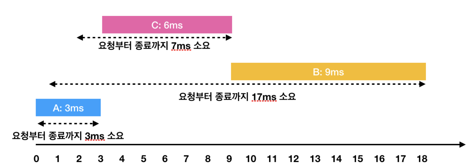 이 때 각 작업의 요청부터 종료까지 걸린 시간의 평균은 10ms(= (3 + 11 + 16) / 3)가 됩니다.