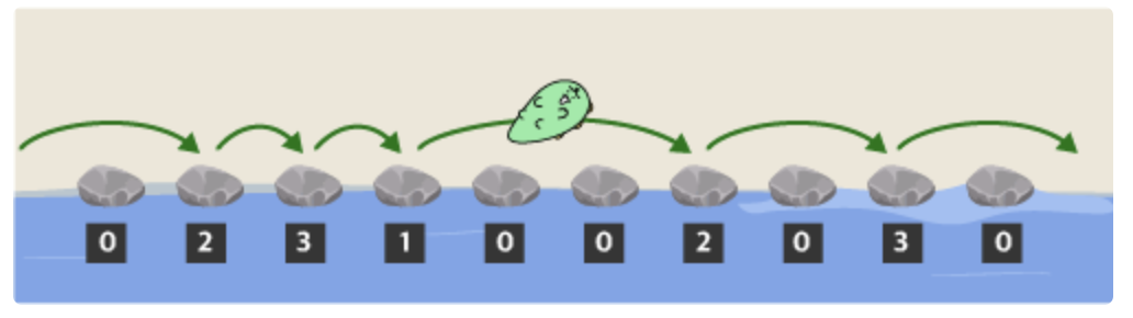 - 디딤돌의 숫자가 0이 되면 더 이상 밟을 수 없으며 이때는 그 다음 디딤돌로 한번에 여러 칸을 건너 뛸 수 있습니다.