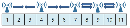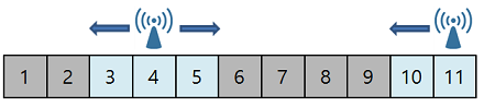 예를 들어 11개의 아파트가 쭉 늘어서 있고, [4, 11] 번째 아파트 옥상에는 4g 기지국이 설치되어 있습니다. 만약 이 4g 기지국이 전파 도달 거리가 1인 5g 기지국으로 바뀔 경우 모든 아파트에 전파를 전달할 수 없습니다. (전파의 도달 거리가 W일 땐, 기지국이 설치된 아파트를 기준으로 전파를 양쪽으로 W만큼 전달할 수 있습니다.)
