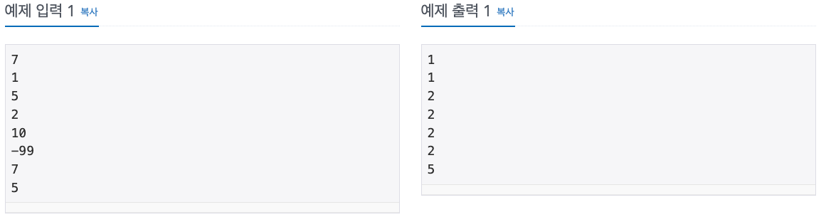 예를 들어 백준이가 동생에게 1, 5, 2, 10, -99, 7, 5를 순서대로 외쳤다고 하면, 동생은 1, 1, 2, 2, 2, 2, 5를 차례대로 말해야 한다. 백준이가 외치는 수가 주어졌을 때, 동생이 말해야 하는 수를 구하는 프로그램을 작성하시오.