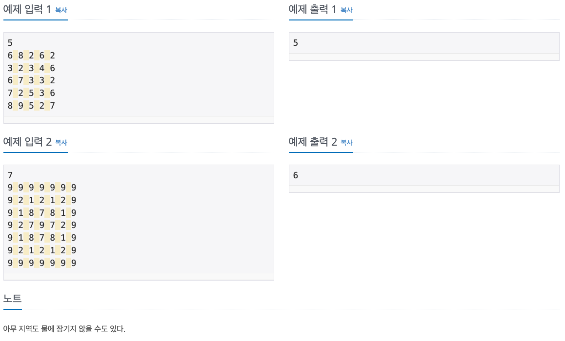 어떤 지역의 높이 정보가 주어졌을 때, 장마철에 물에 잠기지 않는 안전한 영역의 최대 개수를 계산하는 프로그램을 작성하시오.
