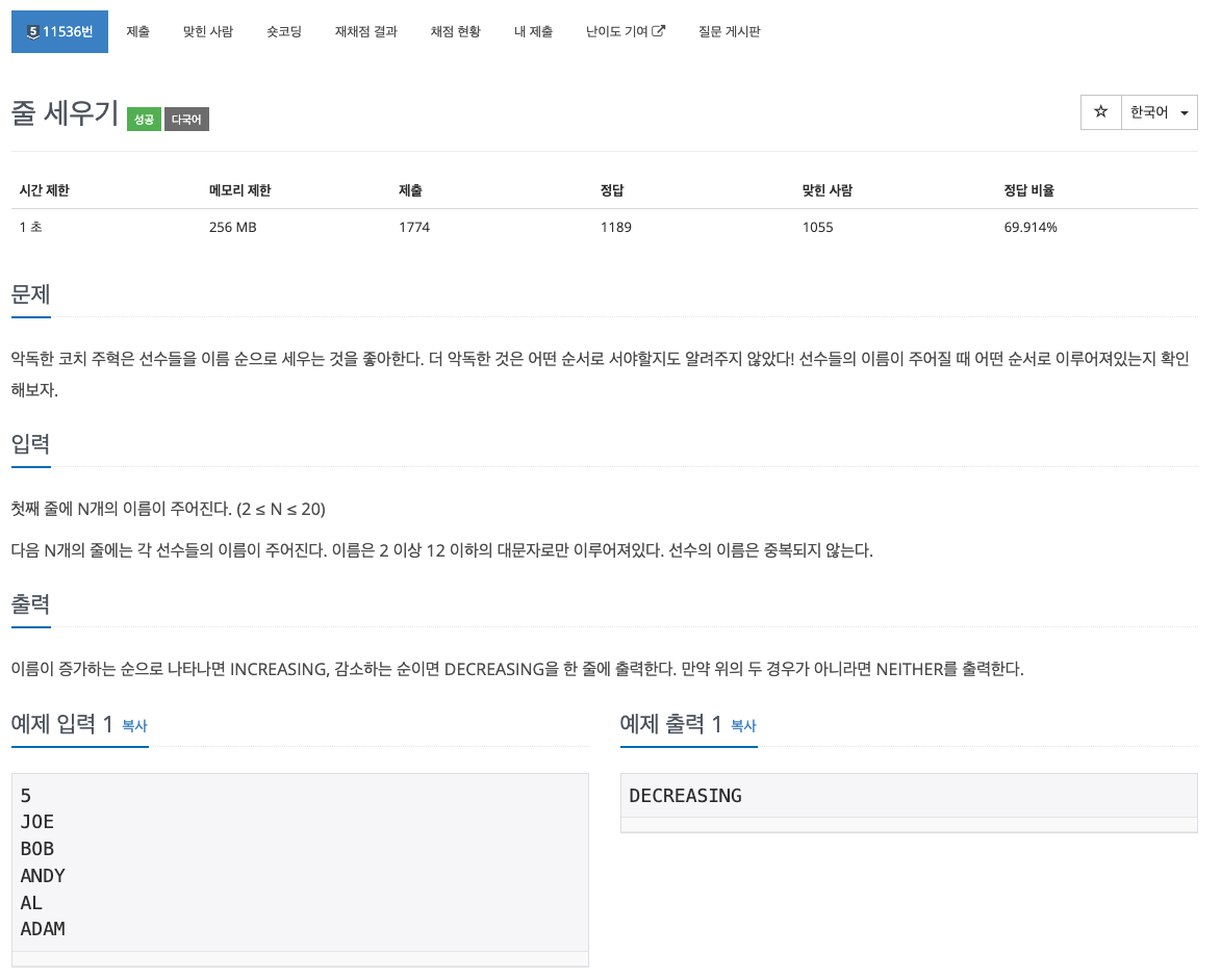 이름이 증가하는 순으로 나타나면 INCREASING, 감소하는 순이면 DECREASING을 한 줄에 출력한다. 만약 위의 두 경우가 아니라면 NEITHER를 출력한다.
