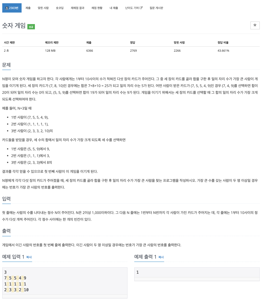 N명이 모여 숫자 게임을 하고자 한다. 각 사람에게는 1부터 10사이의 수가 적혀진 다섯 장의 카드가 주어진다. 그 중 세 장의 카드를 골라 합을 구한 후 일의 자리 수가 가장 큰 사람이 게임을 이