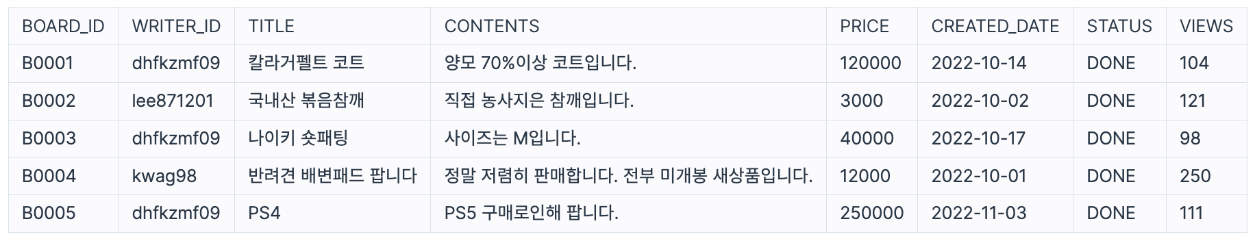 USED_GOODS_BOARD 테이블이 다음과 같고