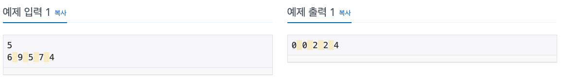 예를 들어 높이가 6, 9, 5, 7, 4인 다섯 개의 탑이 수평 직선에 일렬로 서 있고, 모든 탑에서는 주어진 탑 순서의 반대 방향(왼쪽 방향)으로 동시에 레이저 신호를 발사한다고 하자. 그러면, 높이가 4인 다섯 번째 탑에서 발사한 레이저 신호는 높이가 7인 네 번째 탑이 수신을 하고, 높이가 7인 네 번째 탑의 신호는 높이가 9인 두 번째 탑이, 높이가 5인 세 번째 탑의 신호도 높이가 9인 두 번째 탑이 수신을 한다. 높이가 9인 두 번째 탑과 높이가 6인 첫 번째 탑이 보낸 레이저 신호는 어떤 탑에서도 수신을 하지 못한다.