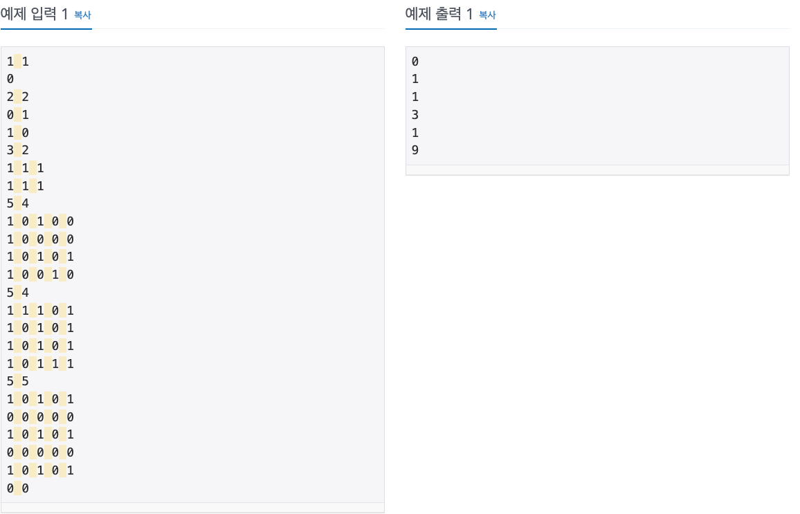 둘째 줄부터 h개 줄에는 지도가 주어진다. 1은 땅, 0은 바다이다.